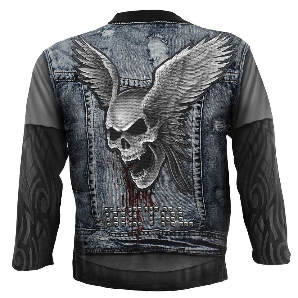 Patches and studs. Live out your rock'n'roll dreams in this realistically worn looking mock-denim jacket design. We salute you!